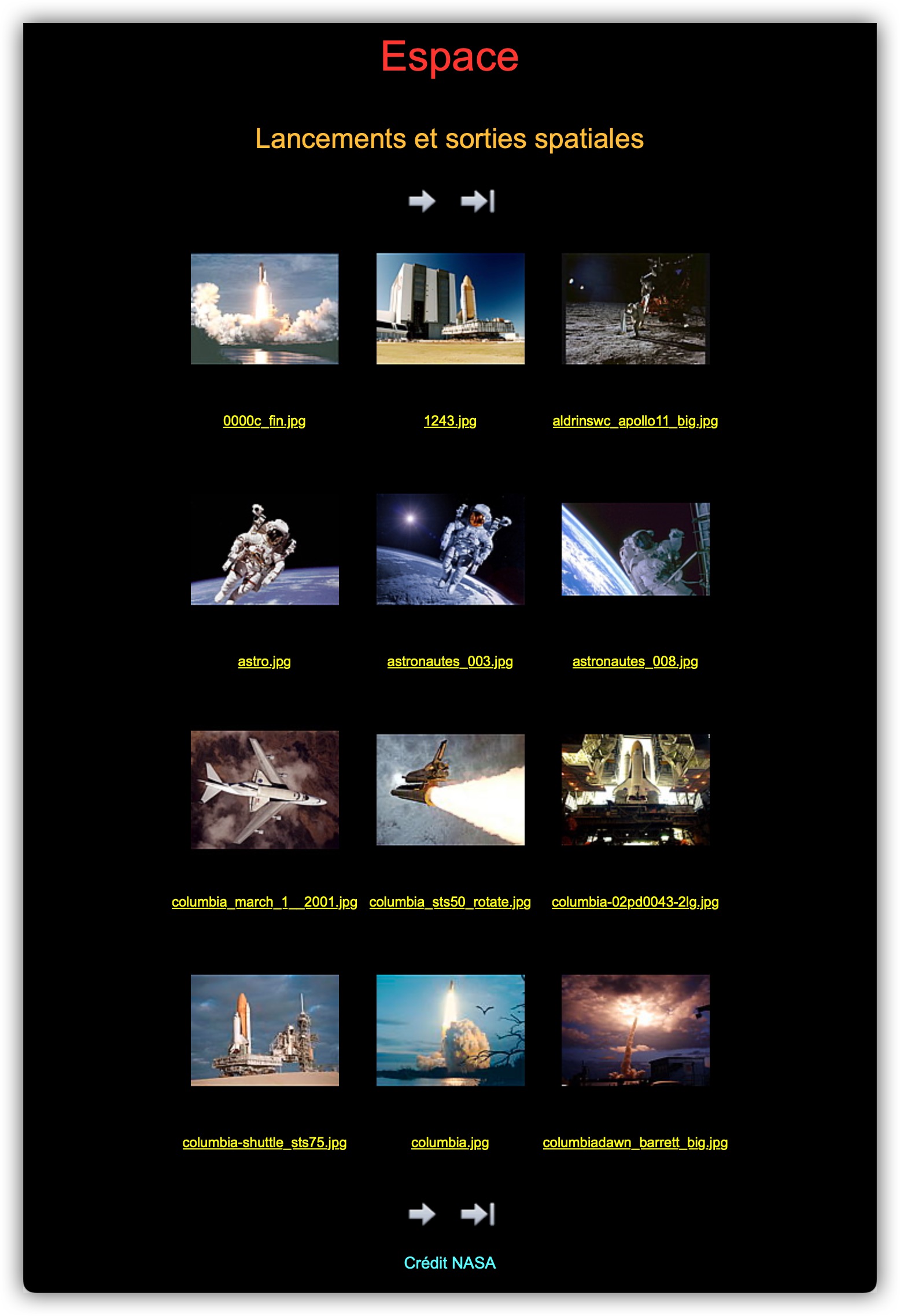 Exemple du résultat obtenu après génération du catalogue HTML, veuillez noter que des flèches de navigation sont automatiquement ajoutées :
