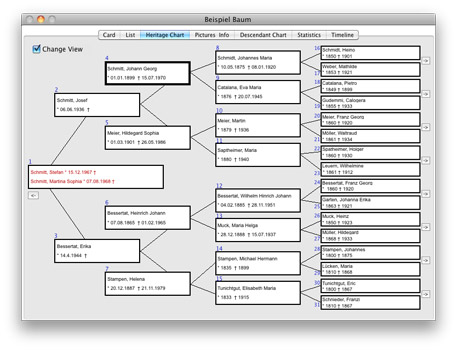 Examinez rapidement le résultat de vos recherches, naviguez dans votre arbre généalogique, éditez ou ajoutez directement des personnes, tout cela est possible à partir de ce point de départ idéal pour votre recherche l’arbre généalogique interactif. Vous pouvez afficher jusqu'à huit générations, y compris les frères et soeurs, choisir différents angles d'affichage pour visualiser votre arbre généalogique. En option vous pouvez afficher et télécharger des personnes directement à partir de FamilySearch ou ajouter des informations sur les personnes affichées par l'arbre. L’arbre interactif de MacFamilyTree 9 deviendra un compagnon indispensable pour explorer l’histoire de votre famille.