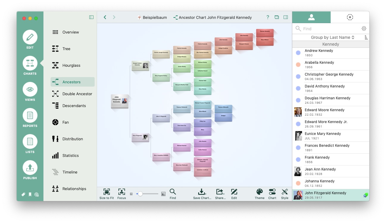 Besoin de personnaliser vos graphiques ? MacFamilyTree est livré avec un éditeur de graphiques intégré vous permettant de personnaliser chaque partie d'un graphique : repositionnement des éléments, modification des polices, des couleurs et du texte ou suppression de certaines parties d'un graphique qui ne devraient pas être visibles afin que le graphique corresponde exactement à vos attentes.