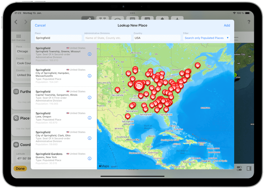 Pouvoir suivre les lieux associés aux événements et aux personnes peut sembler banal, mais MacFamilyTree 11 est la première application au monde conçue pour cartographier correctement ces détails, tant pour le présent que pour le passé. Notre outil de gestion des lieux, entièrement repensé, vous permet de rechercher et de documenter tous les sites pertinents ou importants (cimetières, bureaux d'enregistrement, parcs, etc.), et pas seulement les villes. La base de données préinstallée de MacFamilyTree 11 contient une multitude de détails utiles, notamment des noms multilingues et historiques, des points d'intérêt, des points de repère, etc.