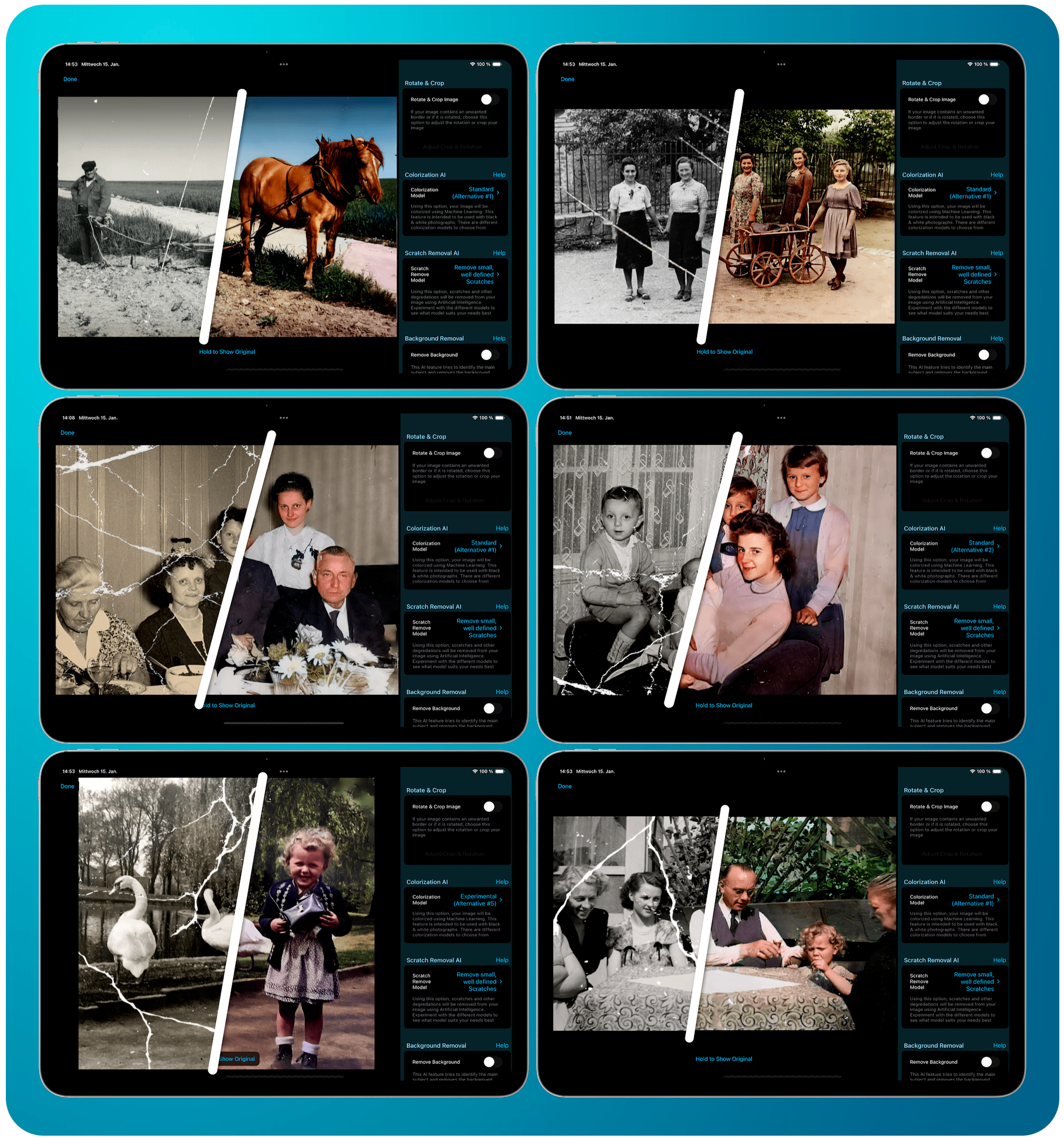 MacFamilyTree peut insuffler une nouvelle vie aux vieilles photos de famille en noir et blanc, en les représentant en couleur pour le plus grand plaisir de votre famille. Apportez un nouvel éclat à vos précieux souvenirs de famille, grâce à la fonction de colorisation de MacFamilyTree, basée sur l'intelligence artificielle et l'apprentissage automatique. Pour la première fois, regardez vos photos de famille à travers les yeux de vos ancêtres, à une époque où la photographie couleur n'existait pas encore. MacFamilyTree est également capable d'améliorer la qualité des images et la lisibilité des documents - toujours grâce à l'intelligence artificielle.