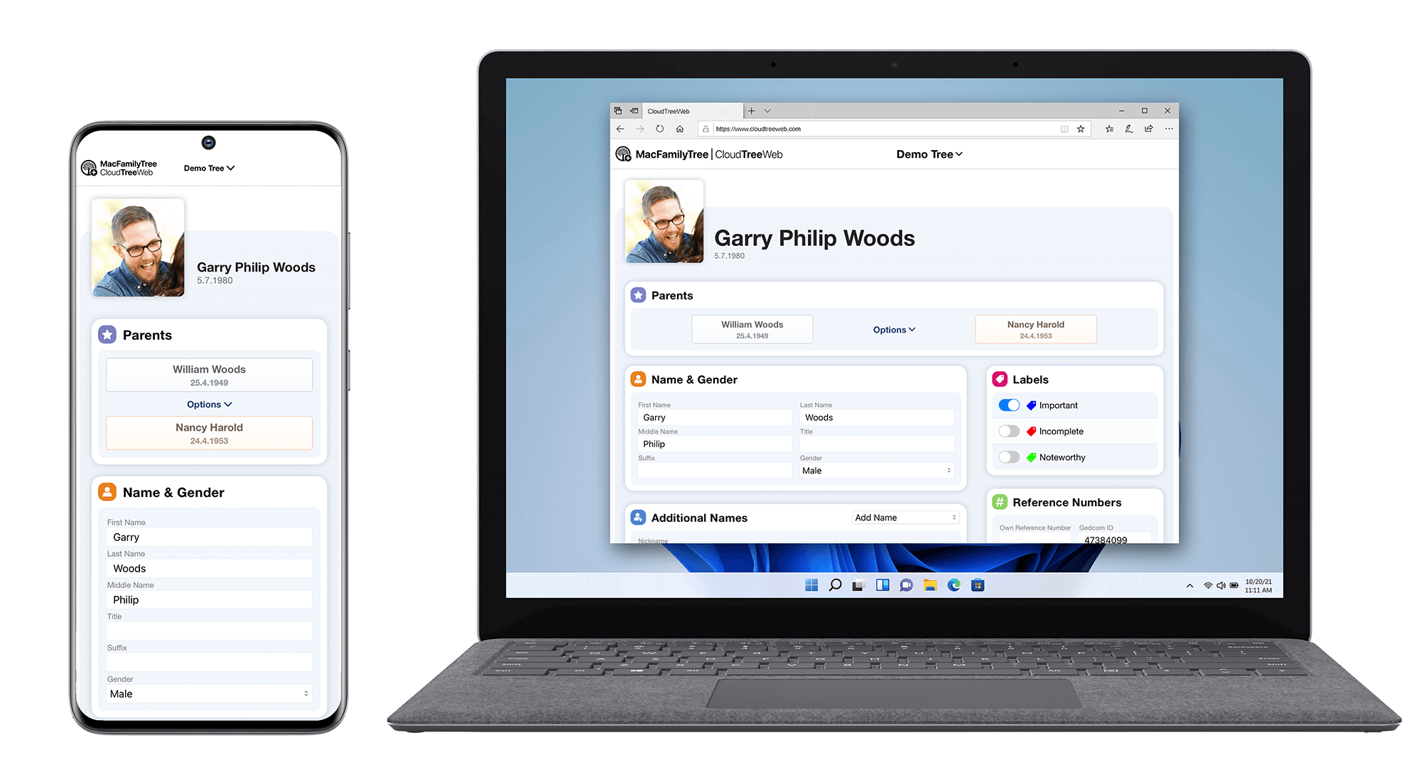 L'une des questions les plus fréquemment posées ces dernières années est la suivante : Comment puis-je faire éditer mon arbre généalogique par des personnes qui n'ont pas de Mac, d'iPhone ou d'iPad ? Voici un aperçu d'une vision à long terme, à savoir CloudTreeWeb. Il s'agit bien plus qu'un simple site internet, CloudTreeWeb met la rubrique Édition de MacFamilyTree ou MobileFamilyTree à la disposition des membres de la famille ou des amis sous la forme d'une version internet. Qu'est-ce que cela a de spécial, demanderez-vous ? Cette option permet également de collaborer en temps réel, les modifications étant automatiquement synchronisées sur tous les appareils en quelques secondes.