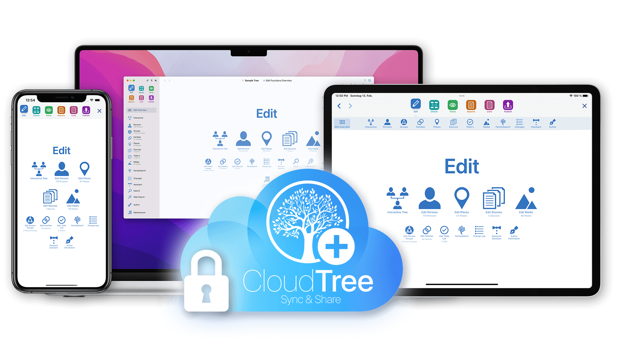Dès les premiers jours de la généalogie sur ordinateur, une demande récurrente était : comment puis-je travailler sur mon arbre généalogique et mes recherches généalogiques avec d'autres membres de ma famille ? CloudTree Sync&Share a ouvert une nouvelle ère dans la généalogie numérique. Ainsi MacFamilyTree 10 et MobileFamilyTree 10 placent la barre encore plus haut en étant encore plus rapide et plus puissant que jamais.
