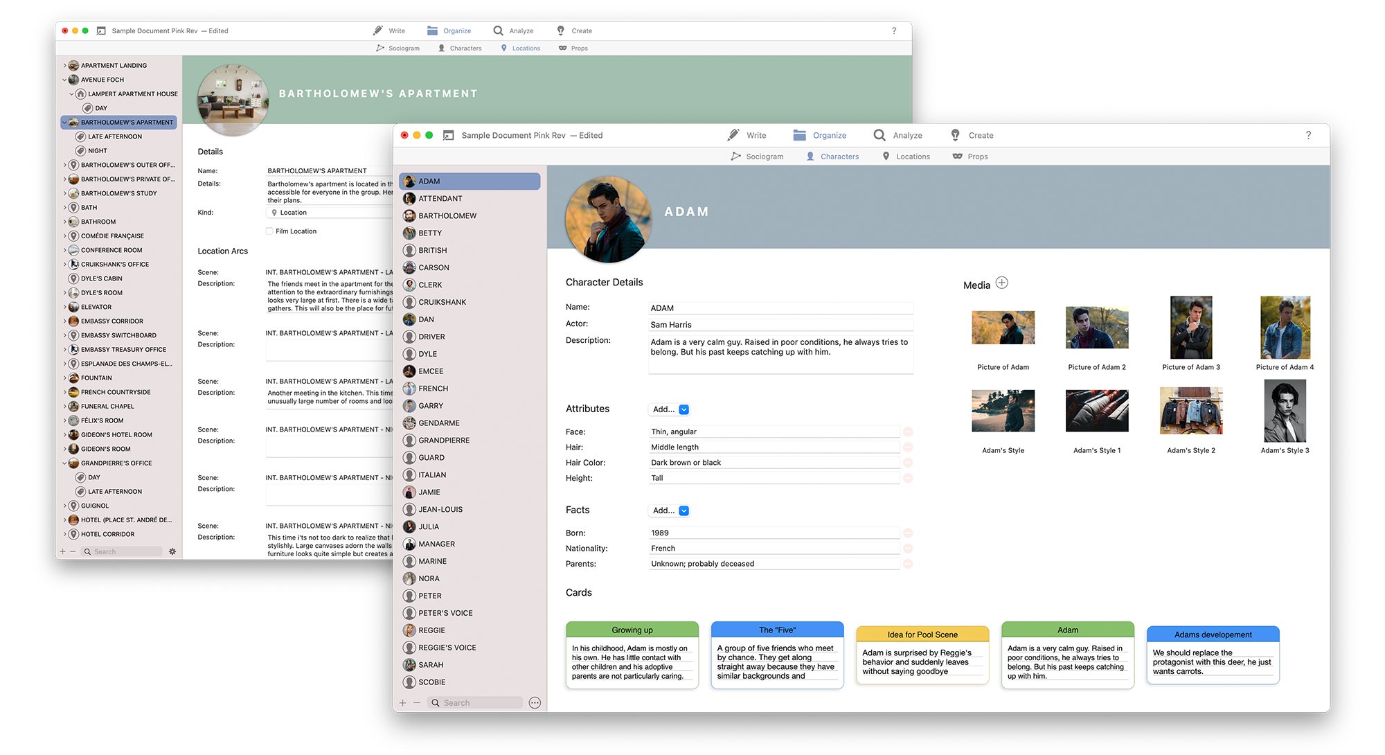 Comme il est impossible de mémoriser tous les détails de chaque personnage et de chaque lieu, FiveActs propose des outils utiles pour vous aider à garder une trace de tout. Chaque fois qu'un nouveau personnage apparaît dans votre histoire, FiveActs créera automatiquement une entrée pour ce personnage, tout en vous permettant également d'ajouter des personnages manuellement. Il en va de même pour les lieux : Saisissez et enregistrez les noms, descriptions et autres détails, ou ajoutez des images pour vous aider à élaborer tous les éléments importants de votre scénario. FiveActs compilera tous les détails pertinents dans des profils de personnages et de lieux. Cela inclut des informations sur le moment et l'endroit où chaque personnage ou lieu apparaît dans l'intrigue, et s'ils doivent apparaître ou non dans des cartes d'idées ou des sociogrammes.