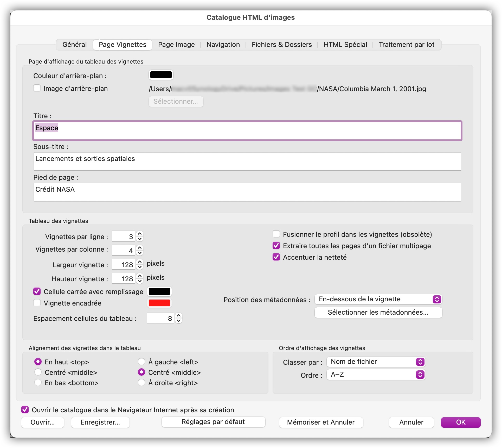 Réglages des paramètres pour la génération d'un catalogue HTML :