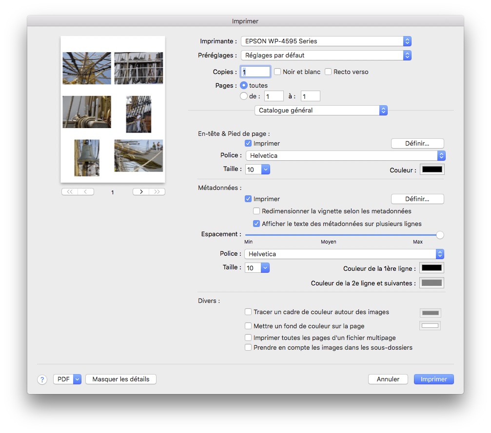 Réglages des paramètres d'impression du catalogue avec une prévisualisation du résultat, avant qu'il ne soit imprimé :