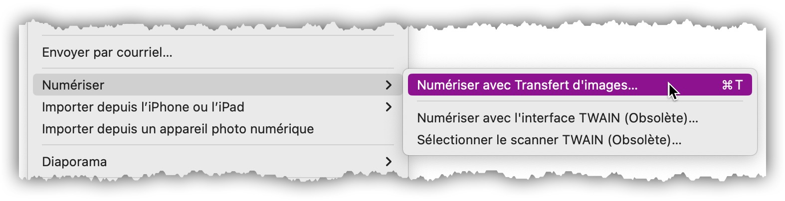 Nota important : L'interface TWAIN bien que disponible a été mise en obsolescence par Apple depuis macOS 10.9 (Mavericks), GraphicConverter 12 la conserve tant que des utilisateurs peuvent utiliser cette interface avec leur scanner. L'utilisation de l'interface Transfert d'images reste cependant recommandée.