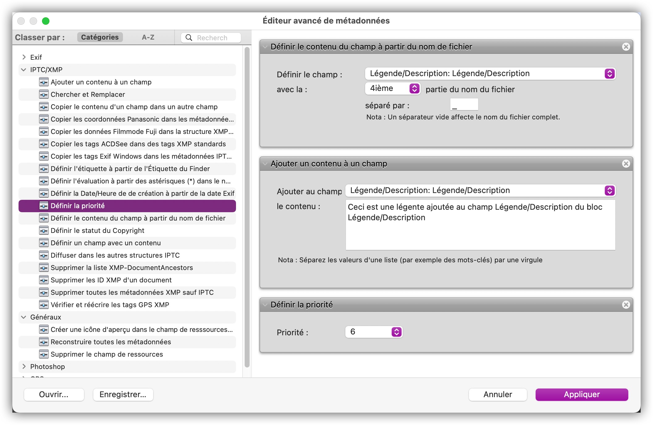 Vous pouvez désormais combiner plusieurs étapes d'édition en une seule passe, les enregistrer et les rouvrir à tout moment. Ceci présente l’avantage de pouvoir supprimer plusieurs métadonnées telles que le temps d'exposition et l'ouverture par exemple en une seule étape d'édition et de copier le contenu d'un champ IPTC dans un autre champ, etc. Les images ne sont plus ouvertes et réenregistrées. Cela signifie qu'il n'y a pas de perte de qualité avec les formats compressés tels que JPG et HEIC, et que les images RAW peuvent également être éditées. La fonction s’active depuis le menu Métadonnées Générales.