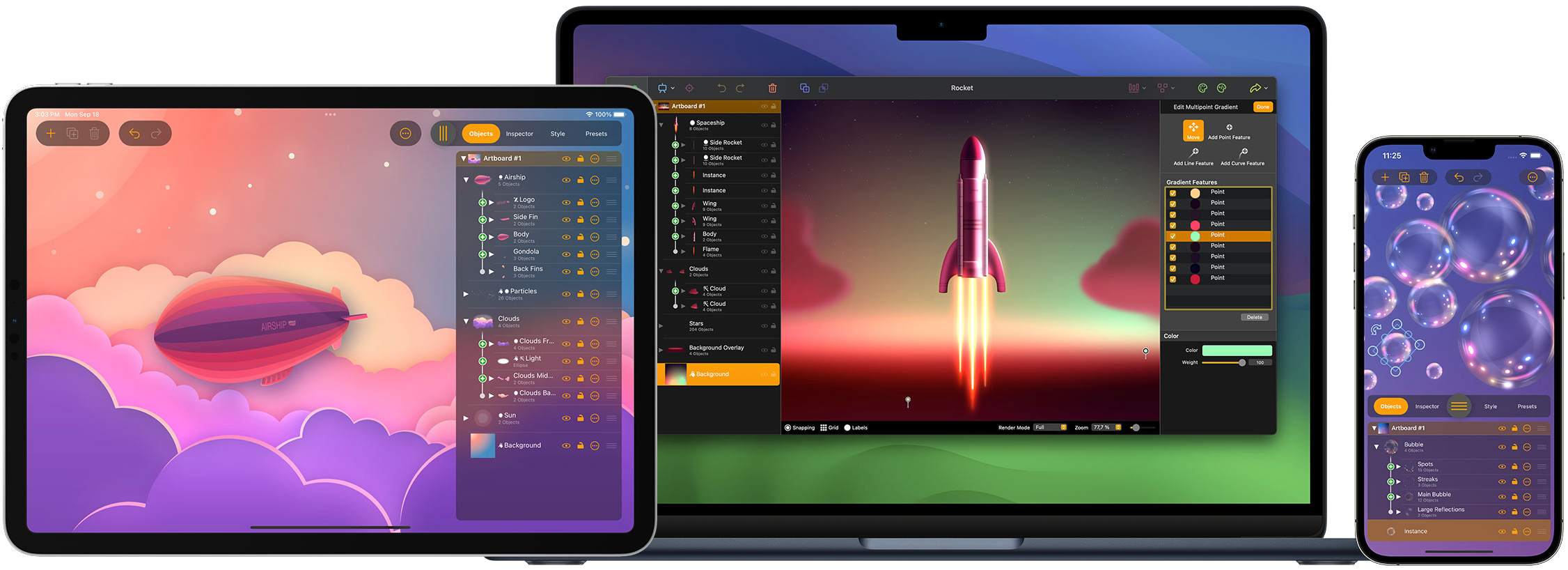 L'une des demandes les plus fréquentes a toujours été : "Pourquoi n'y a-t-il pas de version pour iPad ? Pourquoi n'existe-t-il pas de version iPad de Logoist ? Nous sommes donc heureux d'annoncer que Logoist est désormais disponible à la fois pour le Mac, l'iPad et l'iPhone. Une application Mac puissante qui fait ses débuts en tant que suite graphique vectorielle de bureau entièrement fonctionnelle sur les appareils mobiles !
