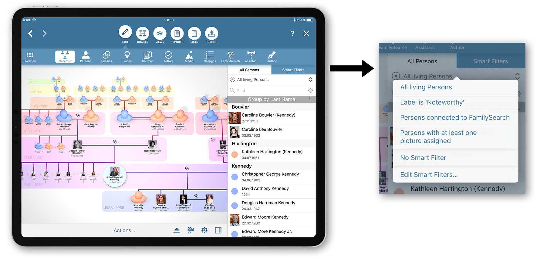 Recherchez, collectez et visualisez des données, parcourez un large éventail de graphiques et de rapports visuellement attrayants et partagez vos découvertes avec d’autres personnes et tout cela de manière incroyablement simple avec MobileFamilyTree.