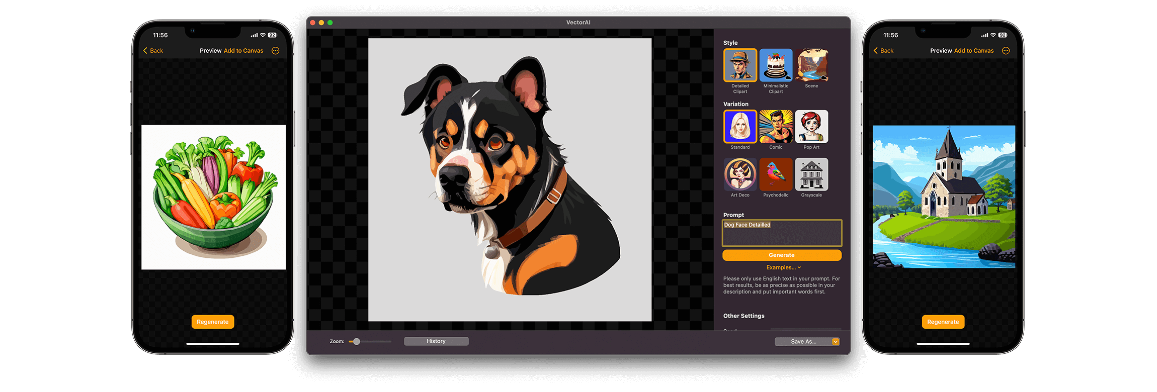 VectorAI est le premier et le seul créateur de graphiques vectoriels « intégré dans l’appareil » pour Mac, iPhone et iPad. Téléchargez les styles vectoriels souhaités (ClipArt, Clipart minimaliste, Scènes) directement à partir de l'application, et la création de l'image entière se fait directement sur l'appareil. Toutes les données restent sur votre Mac, iPhone ou iPad et sont traitées exclusivement localement, sans être transmises à un serveur externe.