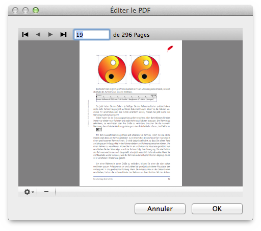 À partir de cette fenêtre vous pourrez rapidement naviguer dans le document PDF et supprimer la page affichée en cliquant sur le bouton [–] situé dans le coin inférieur gauche de la fenêtre. (Le document PDF original n'en sera pas pour autant modifié.)