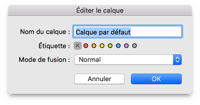 Le dialogue est explicite et se suffit à lui-même. Il offre la possibilité d'affecter un type de fusion distinct à tout le calque d'un document. Le type de fusion est détaillé à la fin du chapitre relatif aux [Inspecteurs].