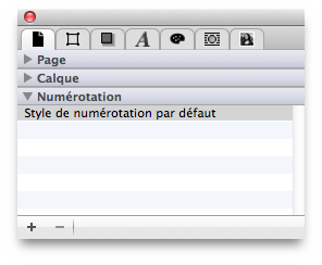 L'inspecteur de numérotation propose une liste de styles de numérotations. Par défaut un style de numérotation, nommé Numérotation standard, est disponible. Cliquez sur le bouton [+] situé dans le coin inférieur gauche de l'inspecteur de numérotation pour définir d'autres styles de numérotation. Les styles de numérotation peuvent être supprimés par un clic sur le bouton Moins.