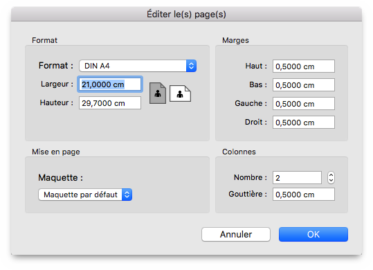 En cliquant sur le bouton [+] situé dans la partie inférieure gauche de l'inspecteur de page, vous créez une ou plusieurs pages dans le document courant. Le dialogue de paramétrage de la page suivant s'affiche, dans lequel vous pouvez définir tous les paramètres nécessaires.