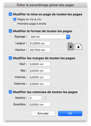 Avec cet élément de menu vous pouvez modifier le paramétrage global des pages du document. Si vous souhaitez modifier les paramètres d'un groupe de paramètres, vous devrez activer au préalable le paramétrage de ce groupe en cochant la case du groupe à modifier.