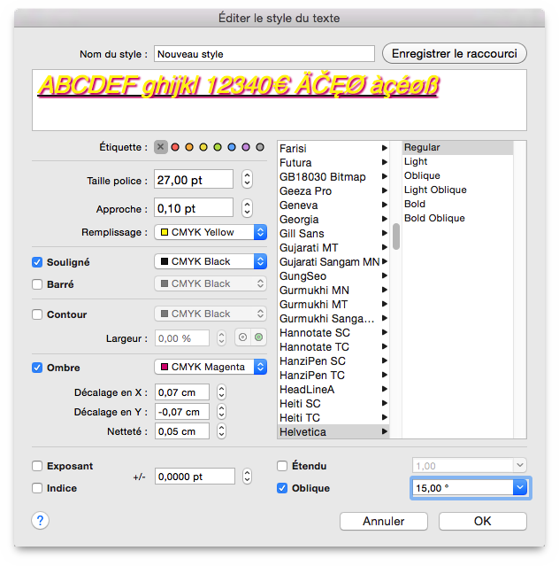 Sélectionnez une couleur de remplissage pour la police sélectionnée. Si le menu local de couleur ne vous propose pas la couleur voulue, veuillez la définir au préalable dans l'inspecteur des Couleurs. Cela est vrai pour tous les menus locaux de couleurs dans ce dialogue.