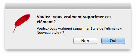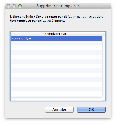 En cliquant sur le bouton [–] situé dans la partie inférieure gauche de l'inspecteur de styles, vous pouvez supprimer le style sélectionné. Si le style a été utilisé dans le document, vous devrez sélectionner un style de substitution.