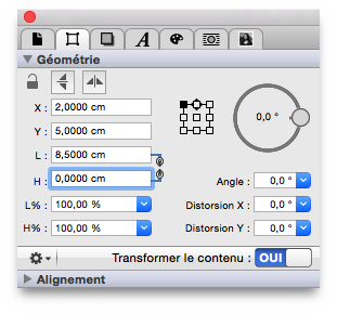 Afin de placer correctement la ligne sous la ligne d'adresse de l'expéditeur, ajustez ces coordonnées dans l'inspecteur d'orientation : X 2 cm, Y 5 cm, W 8,5 cm, H 0 cm.